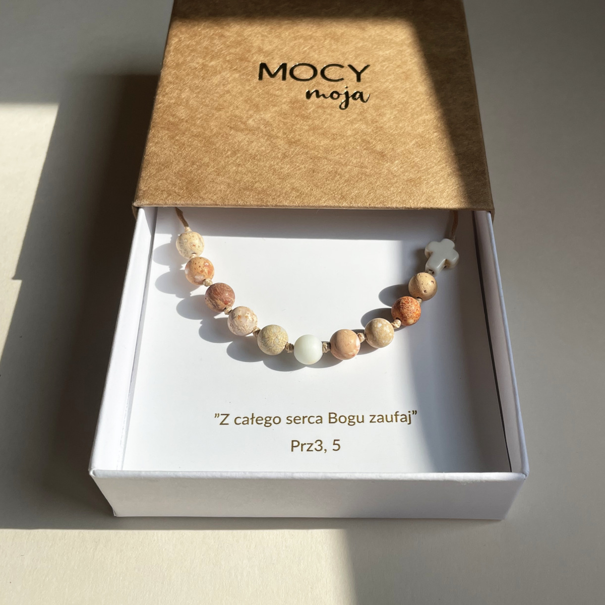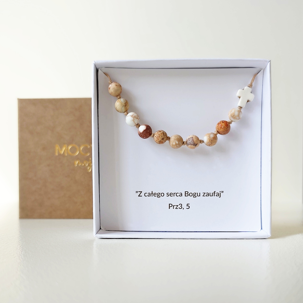 Prawdziwym sercem tego różańca pozostaje modlitwa — cicha, regularna, zakorzeniona w relacji z Bogiem. Bransoletka nie obiecuje zmiany, lecz zaprasza do obecności i wewnętrznego ładu.