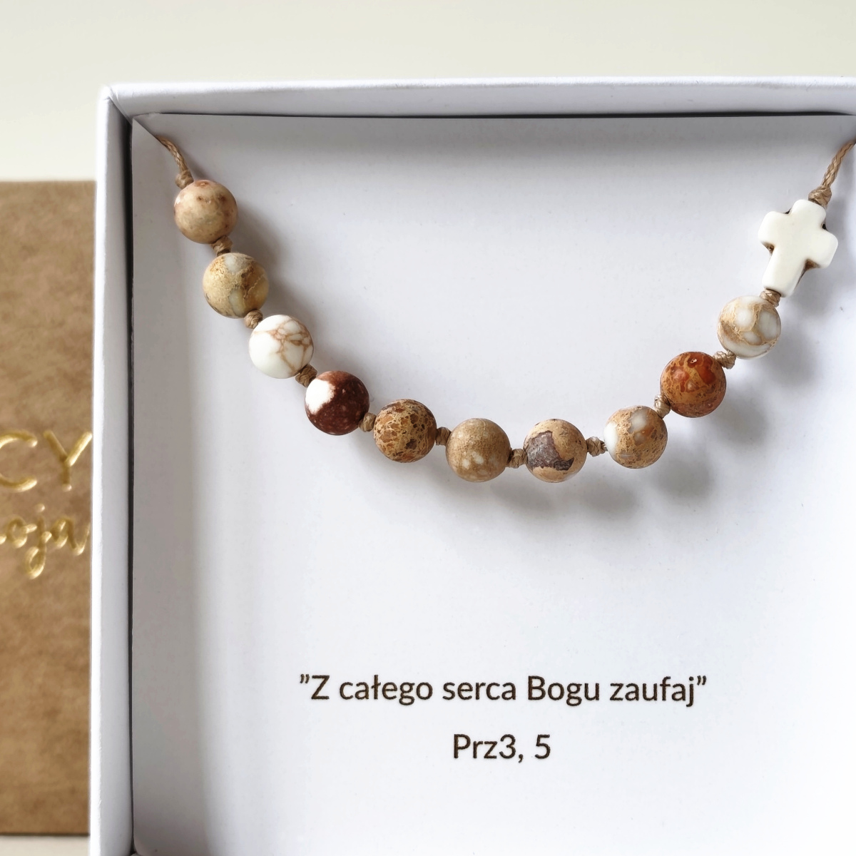 Ten różaniec powstał z myślą o harmonii, która rodzi się z dojrzałości serca. Matowe kamienie jaspisu w ciepłych odcieniach rudości, kremu i beżu tworzą spokojną, ziemistą kompozycję — naturalną, stabilną i głęboko osadzoną w prostocie.